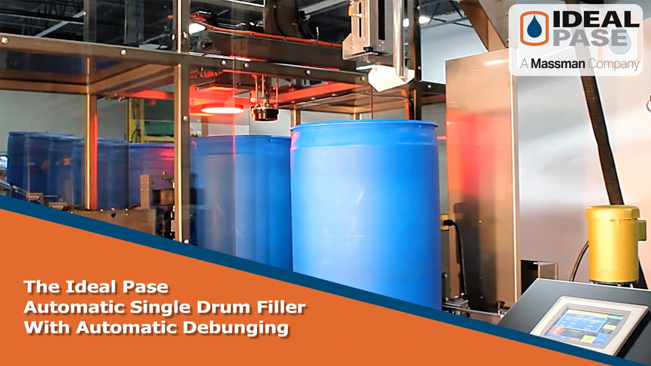 Automatic Single Drum Filling Machine provides auto net weight filling with auto bung detection and orientation. This compact filling machine accepts single drums without the need to hand orientate the bung locations. Empty drums are fed into the filling machine via powered conveyor and rotated by an innovative motorized dual wheel drive system that allows a small overhead laser-based vision system to quickly find the bung location. Once this is complete the dual wheel drive mechanism releases the drum and it is quickly tared and net-weight filled according to the stored filling recipe for that product. The machine performs bottom filling of drums and is perfect for foamy applications. Options include; custom in-feed and out-feed conveyance, fume hoods, sanitary design and explosion proof packages and a variety of drip cups and fume handling options. The machine also features a large color touch screen for machine operation, recipe management and real-time monitoring of the filling process. Auto bung removal and replacement as well as auto cap seal placement options available on this machine.
