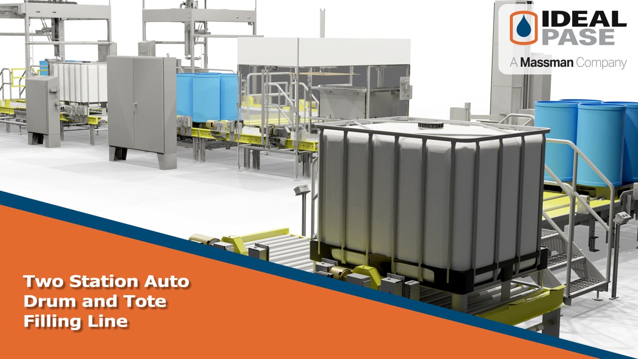 The Ideal Pase custom designed and built sanitary net-weight drum and tote filling line for a major beverage supplier automatically transports; individual totes, four plastic drums on a pallet and fiber drums on a pallet with plastic bag inserts to one of two auto filling stations followed by single stations for; semi-automatic labeling , auto stretch wrapping and auto cover sheet placement (for palletized drums only).