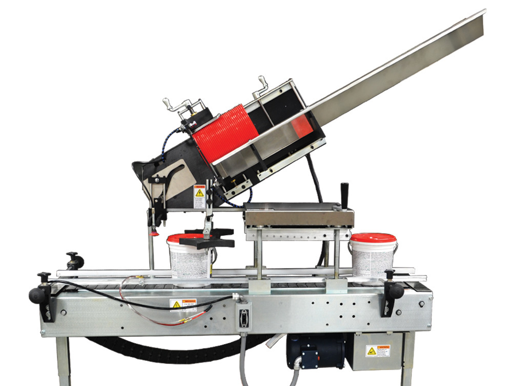 The ALP-1 will place metal and plastic lids from 1/2 pint to one gallon. Individual lids are taken from an infeed stack via a suction cup and released as the filled container passes under the lid.
