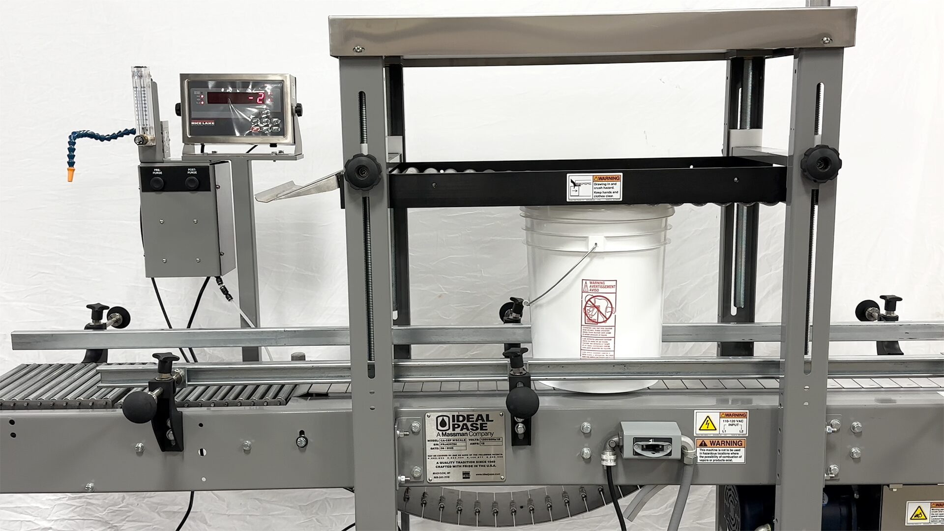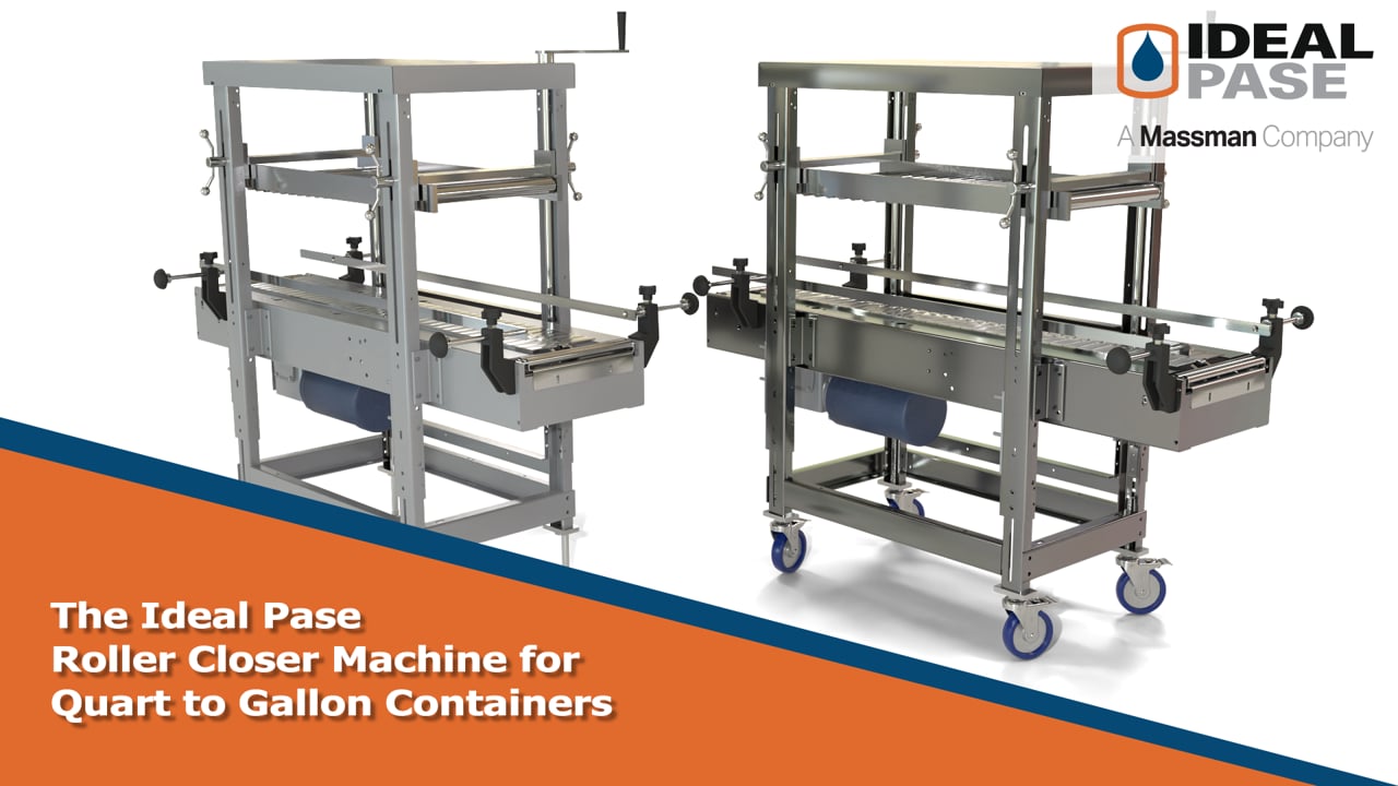The Ideal Pase Roller Closer Machine is for sealing friction and press on lids on quart to 6 gallon containers.