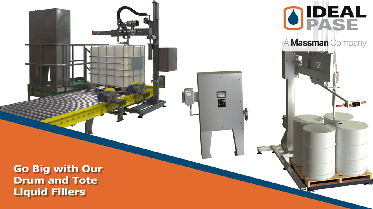 Semi-automatic drum and tote filling machine, with space saving pivot-style lance column, is designed to fill 15, 30 and 55 gallon plastic or metal drums an a variety of tote sizes and styles. High Accuracy Net Weight Filling. Top fill, sub-fill and bottom fill modes. Proportionally controlled filling lance with no upstream valves required. Cleaning-while filling station for optional, additional filling lances. 316/316L pacified product contact parts. Automatic, powered container height adjustments. Allen-Bradley PLC for Machine Control, Color HMI Touch Screen Interface, Multiple conveyor configurations, including: gravity roller or powered conveyors in addition to zoned in-feed and out-feed powered conveyor sections. Swing Arm & Slide to Position the Nozzle. Simple Operation.